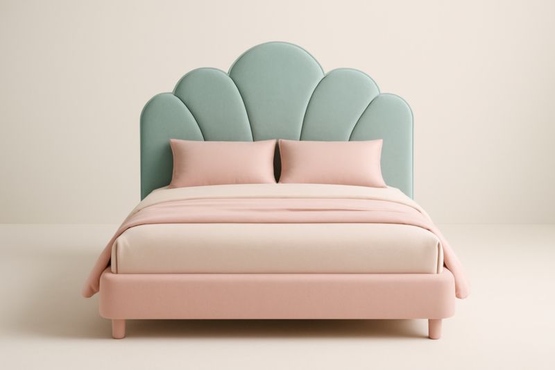 Letto matrimoniale con testiera a conchiglia in tessuto