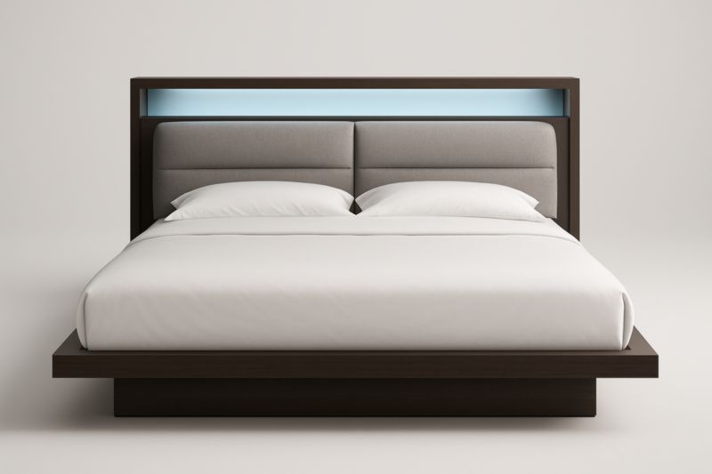Letto Matrimoniale Legno massello Scuro con Testiera Imbottita e Luce LED